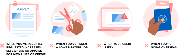 When your credit is iffy. If your credit score isn’t good or excellent, it’s likely that you won’t get approved for more credit because you haven’t shown good judgment with credit in the recent past. Build up your score before asking for a higher limit.