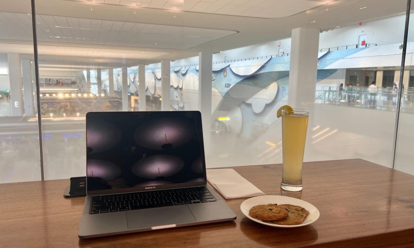 After the meal, I grabbed some chocolate chip cookies and an alcohol-free cocktail and took my laptop to a high-top table overlooking the new terminal.