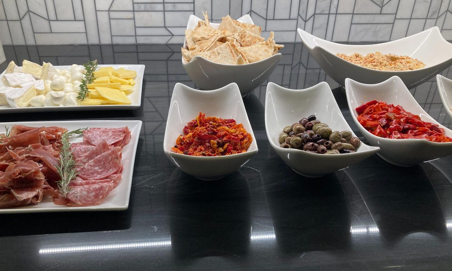 There’s also a charcuterie area with a variety of cheeses, prosciutto, salami, pita chips, olives and hummus.