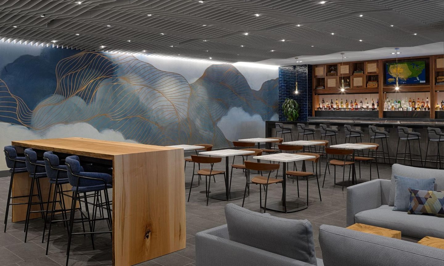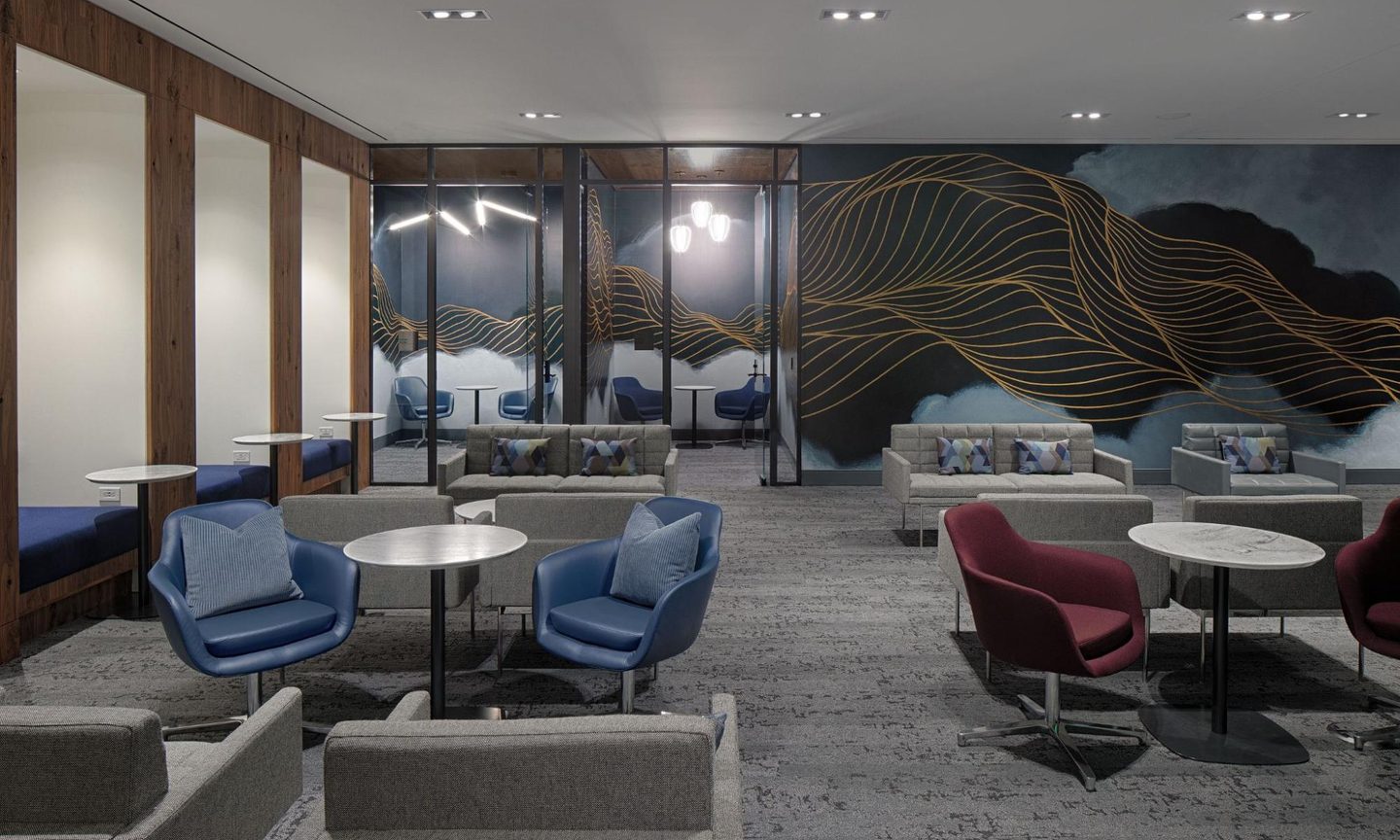 Some design styles that were hot in 2014 have been refreshed for the new decade. Neon green pops of color have been replaced with muted, darker tones. American Express said the new interior design “takes cues from the local vineyards, landscape and the iconic San Francisco fog to give guests a sense of relaxation.”