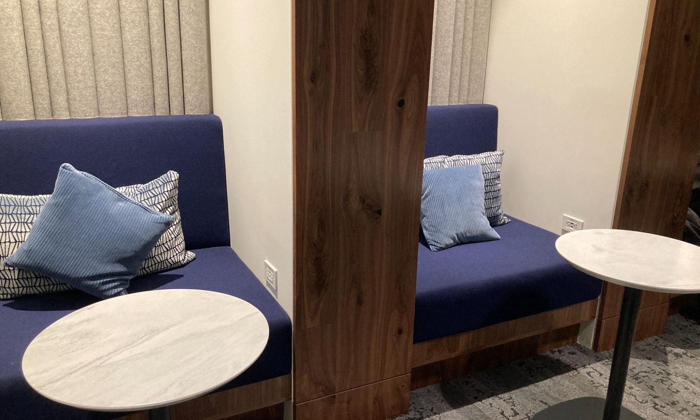 I set foot in the lounge around 11 a.m., and it felt semi-crowded. There was seating for everyone, but you couldn’t be choosy. The cozy nook seating with built-in power outlets got snapped up quickly — but bar seating on tall, firm stools was aplenty.