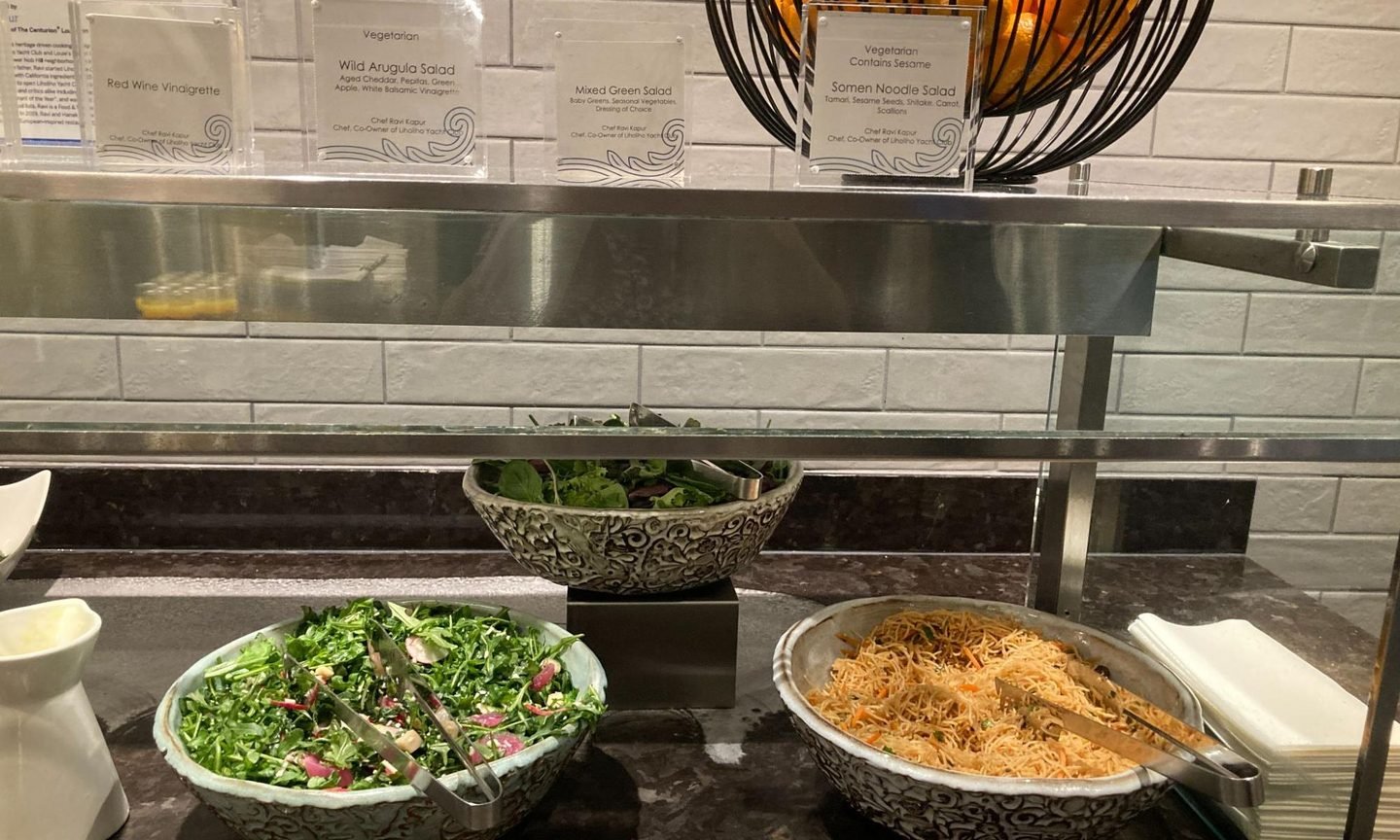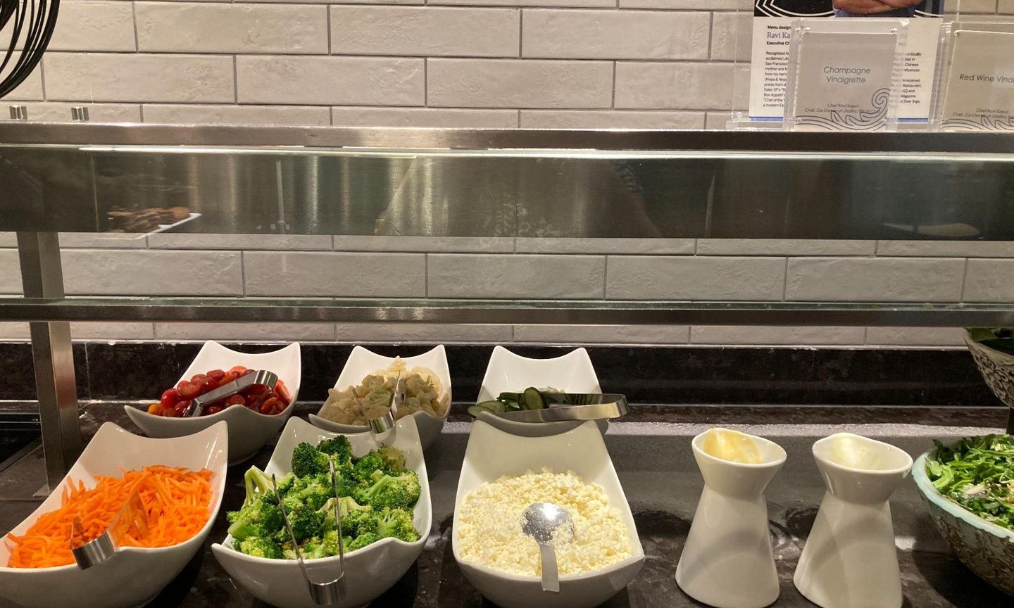 The SFO Centurion Lounge menu at this buffet is designed by Ravi Kapur, the Executive Chef at Liholiho Yacht Club, a popular restaurant in San Francisco. Dishes are a fusion of flavors inspired by Kapur’s lineage (Kapur, born in Hawaii, has a Hawaiian-Chinese mother and his father is from India).