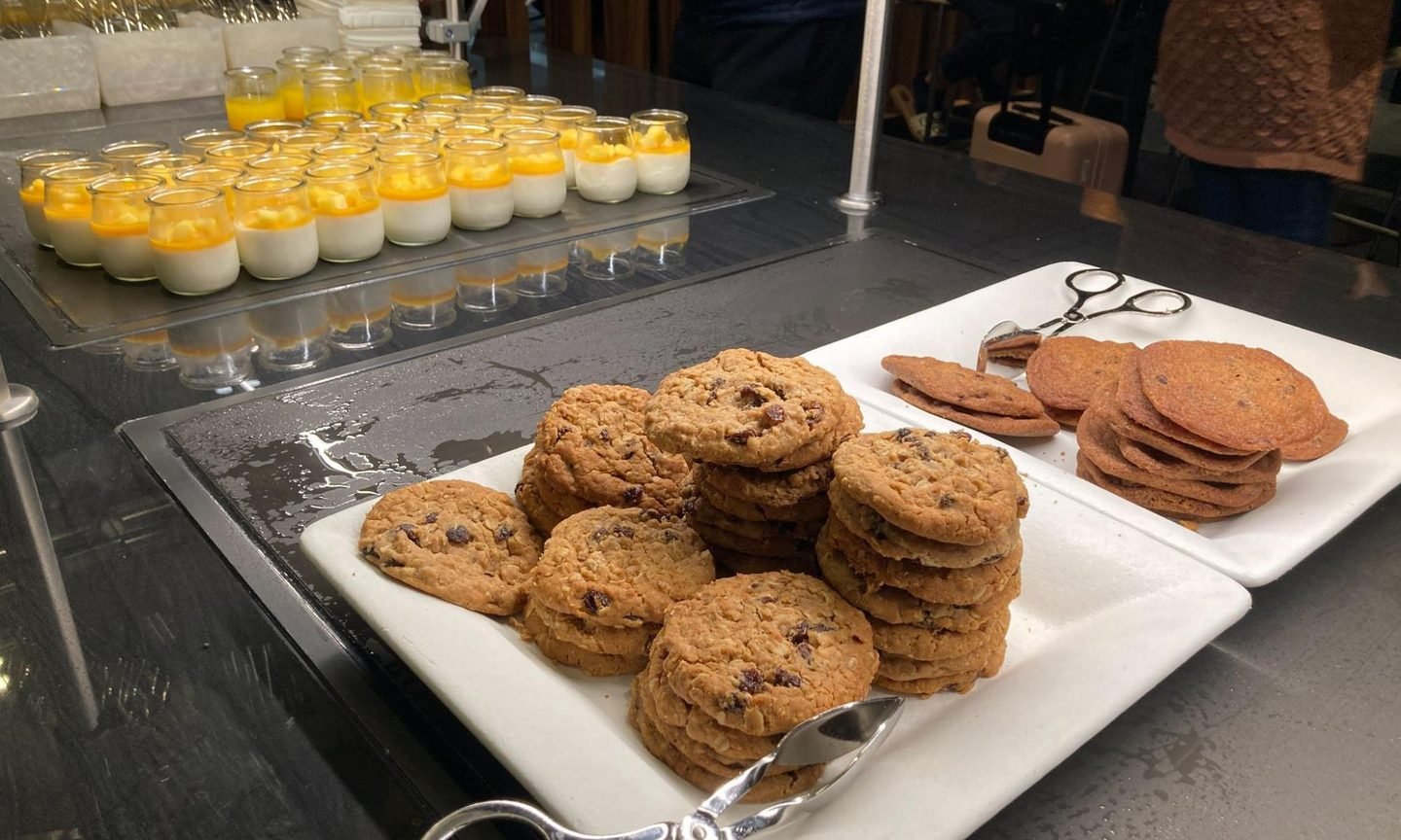 New to the main buffet is a center island devoted entirely to desserts, including cookies and mango panna cotta.