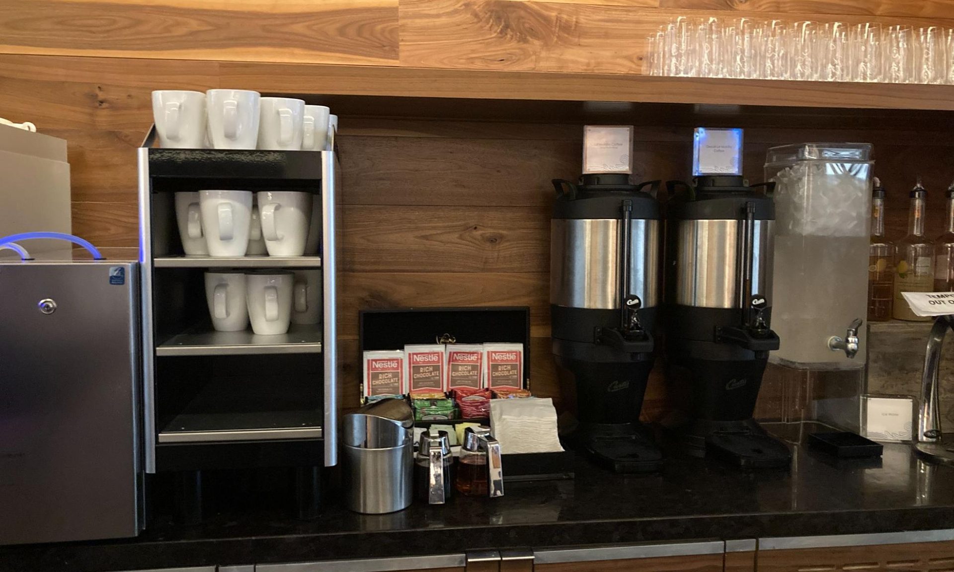 Nonalcoholic choices can be found at a self-serve bar with hot chocolate, teas and flavored water.