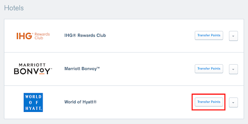 Look for World of Hyatt under “Hotels,” and look for “Transfer Points":