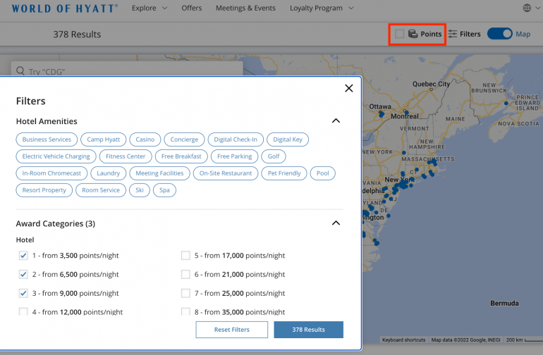 But Hyatt has a better way — if you know where to look. Starting at the "Use Your Rewards" page, a tool lets you search for hotels by category. Click "Explore the Map" and you’ll see "Filters" in the top right-hand corner of the page. Click on it to sort properties by hotel brand, amenities, and most helpful for award night searches: categories with the number of points you need for a stay in each category clearly displayed.