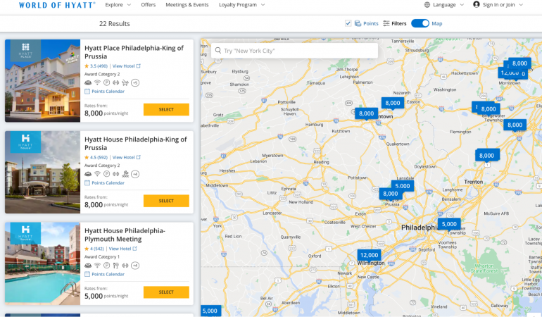 Click on the “378 results” and you will see a map showing all the hotels that fall into your search criteria. If, for example, you’ve decided to go to Philadelphia, zoom into the Philadelphia area and select the “points” option from the menu bar to see your options.