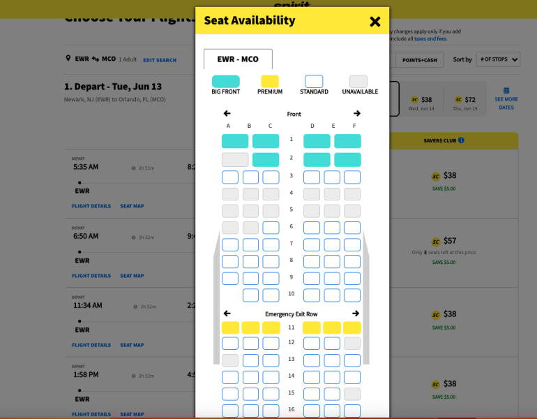Once you do that, you can view seat types and availability on the plane, as shown in this example flight from Newark, New Jersey to Orlando, Florida.