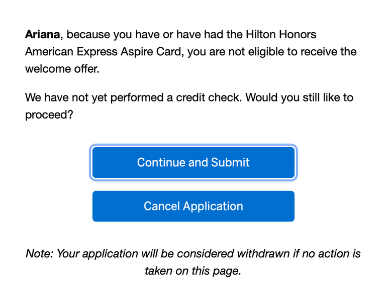 You probably have an idea of which American Express cards you’ve applied to over the past few years, for which you’d therefore be ineligible to earn the welcome bonus again. But if you’ve forgotten, American Express seems to have a safeguard in place. When you apply for a card you’re ineligible for, you’ll receive the following message after filling out your application and hitting “submit:”