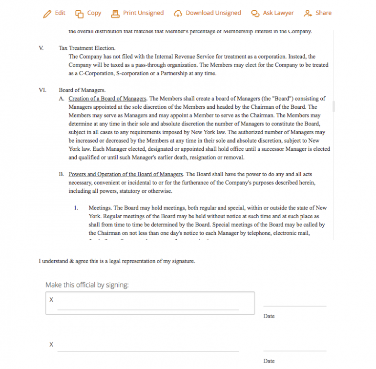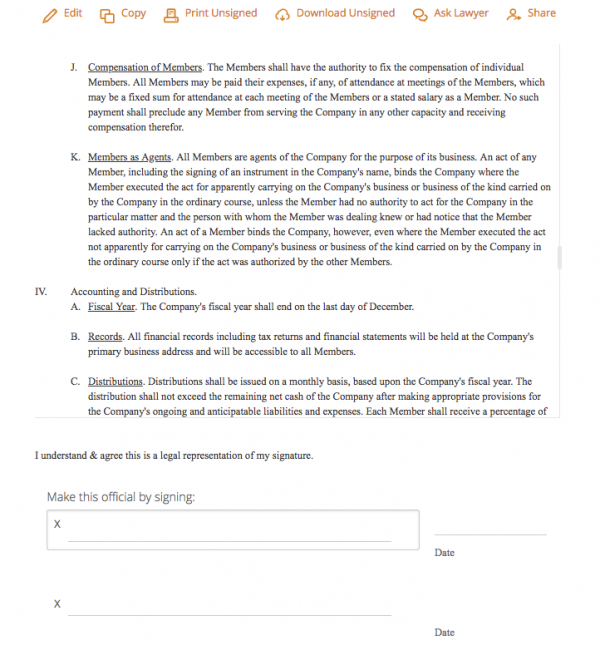 Here are operating agreement templates from Rocket Lawyer for a member-managed LLC and manager-managed LLC.