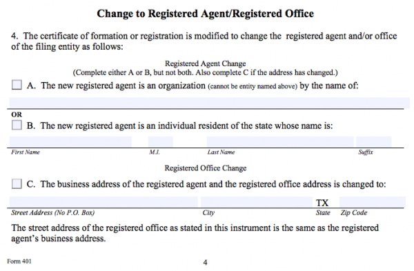 If you change your registered agent or their contact information changes, you’ll need to inform your state’s business filing agency. In most states, there is a change form (example from Texas shown above) that you can download and fill out online. Some states allow electronic filing, while others require that you mail in the form. The fee for changing your appointed agent is usually pretty low, $25 to $50 in most states.