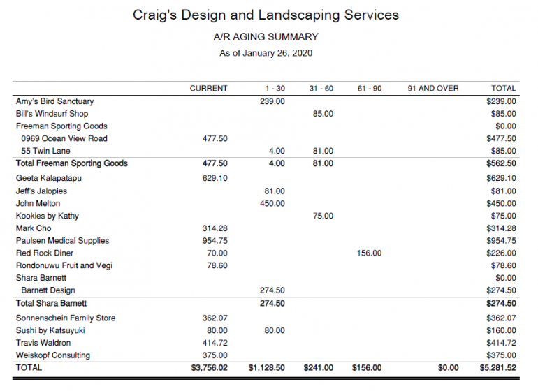 You’ll notice this sample company — Craig’s Design and Landscaping Services — has amounts due from several customers. The total amount due to the company — $5,281.52 (the amount in the bottom right corner of the report) — should match the amount of accounts receivable shown on the company’s accrual-basis balance sheet as of the date of the report (January 26, 2020).