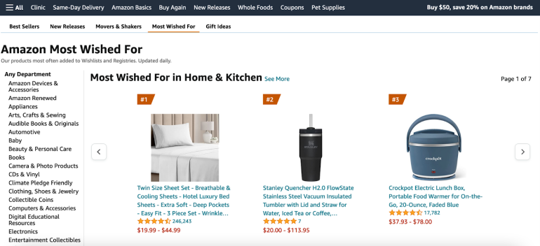 - Most Wished For: Once you’re looking at Hot New Releases, you can toggle to “Most Wished For” and “Gift Ideas” in the secondary navigation bar. “Most Wished For” items are often added to users’ wishlists and wedding and baby registries.