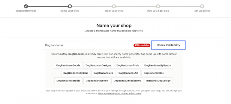 If you try to enter a name that's already in use, Etsy will suggest some similar names that are available: