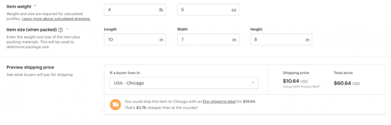 You can opt for Etsy to calculate your shipping prices for you. In this case, you'll be required to fill in item weight and size when packed. Then, based on that information, you'll be able to preview the buyer’s shipping price.