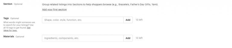 Finally, take advantage of all 13 tags available per item. Shoppers find your item by searching for keywords in the search bar, so work backward and think about what a customer might type into search to discover your item and use those words as your tags.