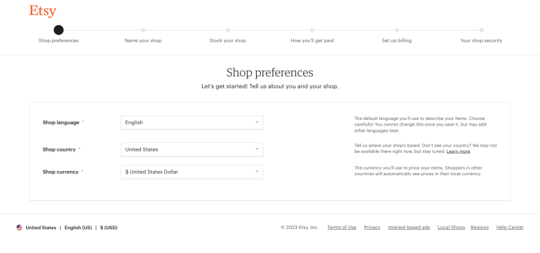 Then, you’ll be directed to the "shop preferences" screen where you'll designate the basic settings for your store — your default language, the country where you’re based and what currency you plan to use.
