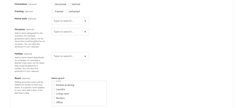 As you start to fill in product details, Etsy will prompt you for additional information specific to that type of product — like whether a piece of art comes framed, whether it’s designed for a certain holiday or occasion, or whether it belongs in a particular room in the home.