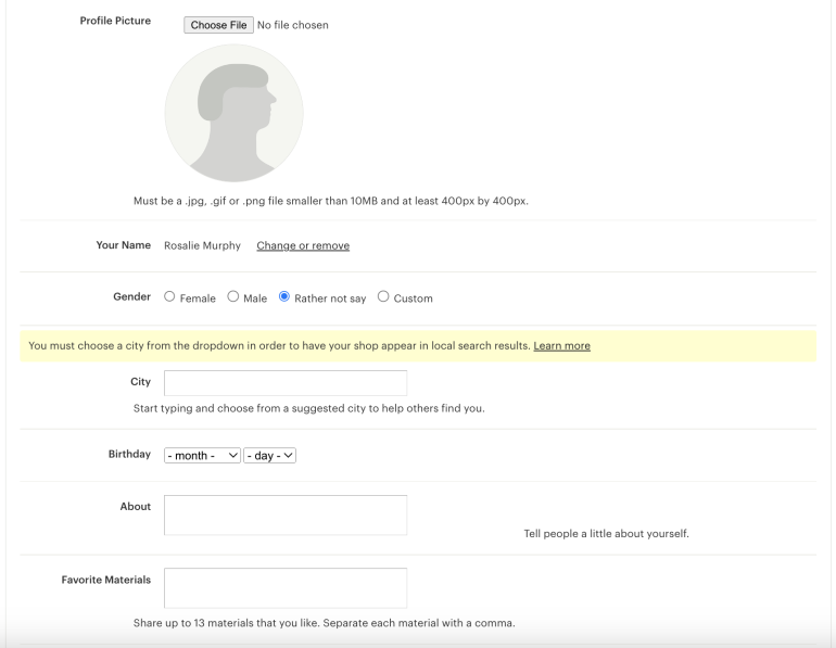 Here are a few sections you can fill out to ensure that your Etsy shop opens (and runs) successfully: