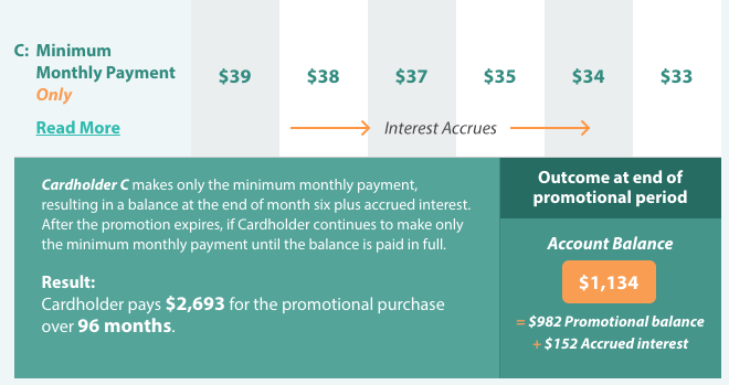 Because the customer didn't pay off the entire balance in six months, all the interest that was accruing over the promo period lands on their statement in the seventh month. Despite having paid $216 so far, their original $1,200 debt has shrunk by only $66. If the customer kept paying only the minimum, it would take eight years to retire the debt, and they'd pay more in interest ($1,493) than they borrowed in the first place.