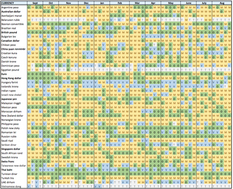 Because the networks look at wholesale rates, it’s unsurprising that their rates are so similar to the interbank rates from Oanda, the foreign exchange platform. The majority of currencies were a toss-up among Oanda, Visa and Mastercard. In the chart below, the green squares denote Oanda offering the best rates.