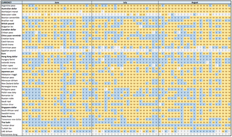 Take the Chinese yuan. In June, July and August, Visa had a better rate than Mastercard for 36 out of 66 weekdays. Mastercard offered a better rate in the other 30 days. Depending on which week or month you were traveling, either network could have been a better choice.