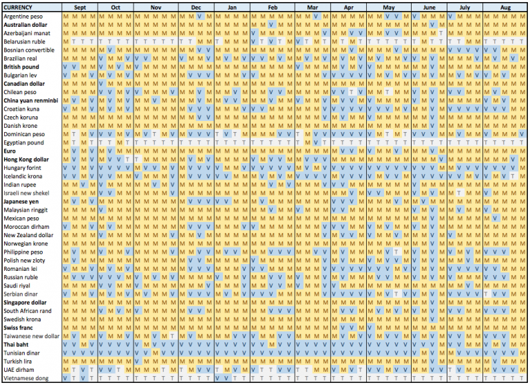 The yellow squares show when Mastercard’s rates were better than Visa’s during the survey period; the blue squares show when Visa’s rates were better; gray squares denote ties. The bolded currencies represent the 10 most-converted currencies (aside from the U.S. dollar) on the SWIFT network, which banks use to send financial transaction information internationally.