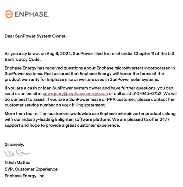- Enphase and Maxeon confirm SunPower's bankruptcy doesn't affect customer manufacturer warranties.