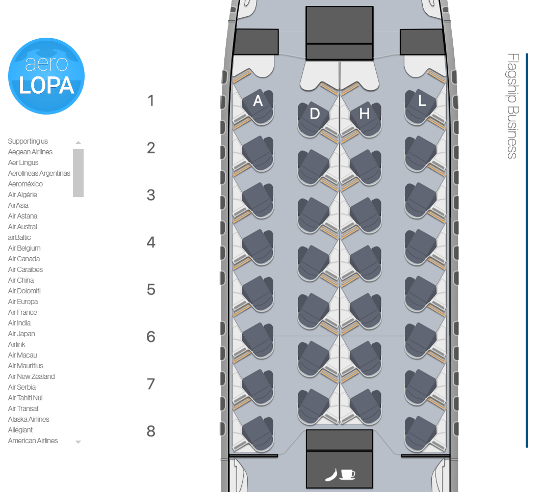 AeroLOPA is a website that has compiled and published hundreds of seat maps covering a vast majority of the airlines in the world. The site digitizes each airline's Layout of Passenger Accommodations — most commonly known by the abbreviation LOPA — letting you see the exact arrangement of aircraft seats, windows, lavatories, bassinets, galleys, etc., for each aircraft type.