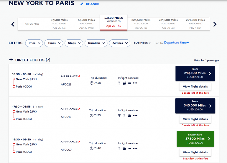 There’s a calendar feature that allows you to look at different dates to find the cheapest price in cash or miles.