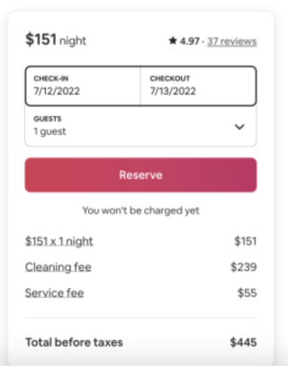 Hidden travel costs like cleaning fees are commonplace on Airbnb. They are explained as a one-time fee pocketed by the host to cover the cost of cleaning their space. Cleaning fees come on top of the base price and a service fee (which Airbnb pockets).