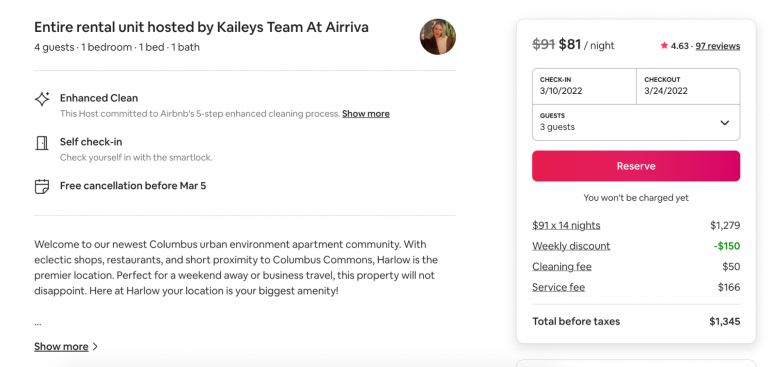 The majority of hosts also charge cleaning fees, which are a one-time charge pocketed by hosts to cover costs such as doing laundry or scrubbing toilets between guest stays. They’re separate from the base price and are in addition to service fees or charges for optional add-ons. While Airbnb maintains that the average cost of the fee is less than 10% of your total reservation, a NerdWallet analysis of Airbnb cleaning fees found that the median cleaning fee was $75 per stay.