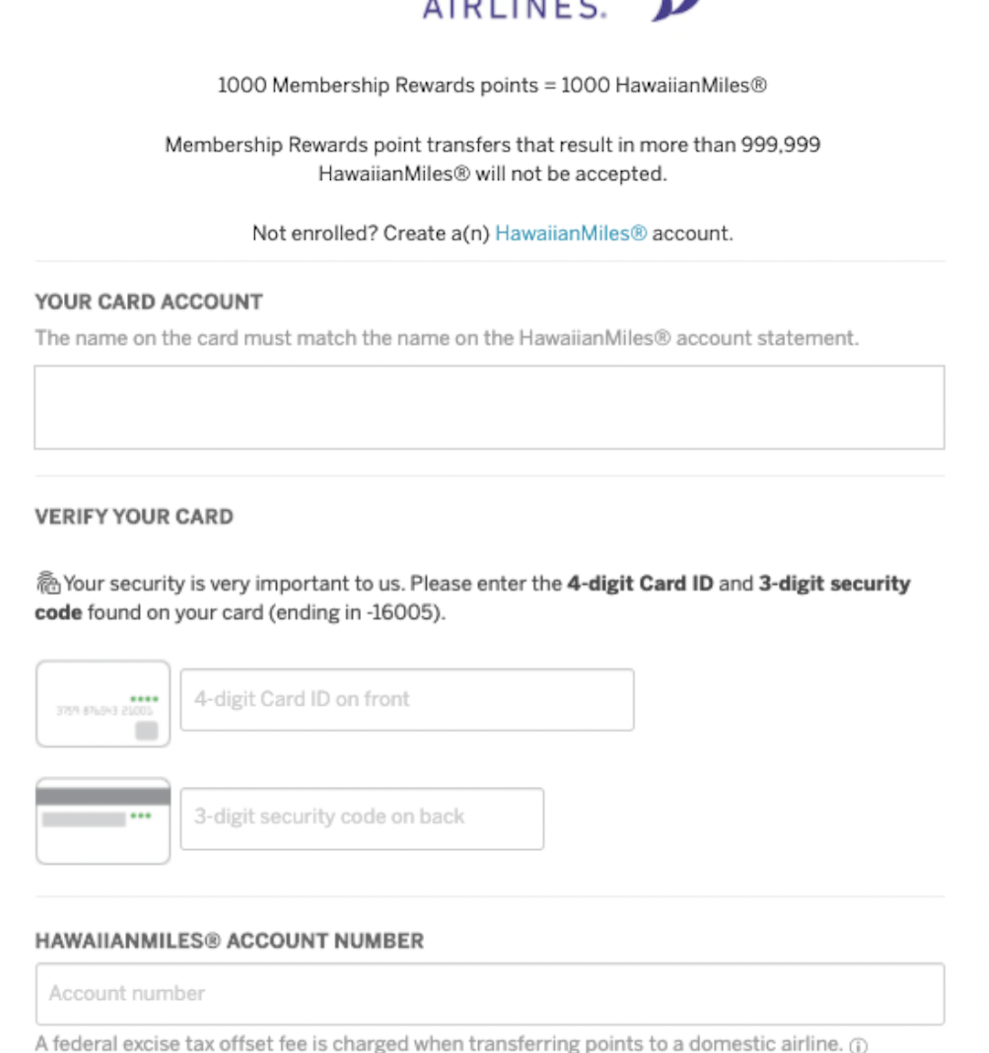 To proceed with a transfer, you'll need to link your American Express Membership Rewards account to the HawaiianMiles program and verify your identity by entering the four-digit card ID and three-digit security code found on the card associated with your Membership Rewards account.