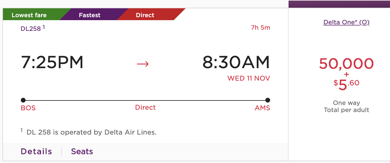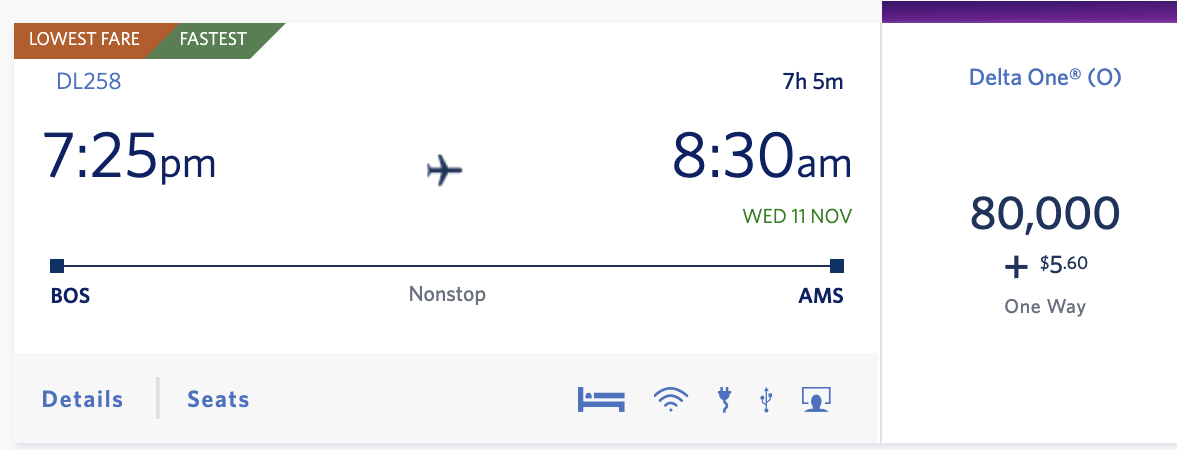 However, on the Delta website, you’d need to spend 80,000 SkyMiles plus $5.60 in taxes for the exact same flight.