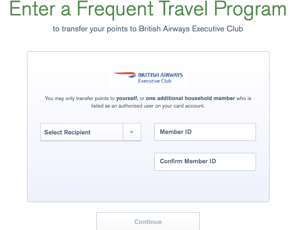 In the Member ID and Confirm Member ID fields, input your British Airways Avios number and then click Continue. The subsequent pages will ask you to enter how many points you’d like to transfer and confirm the amount.