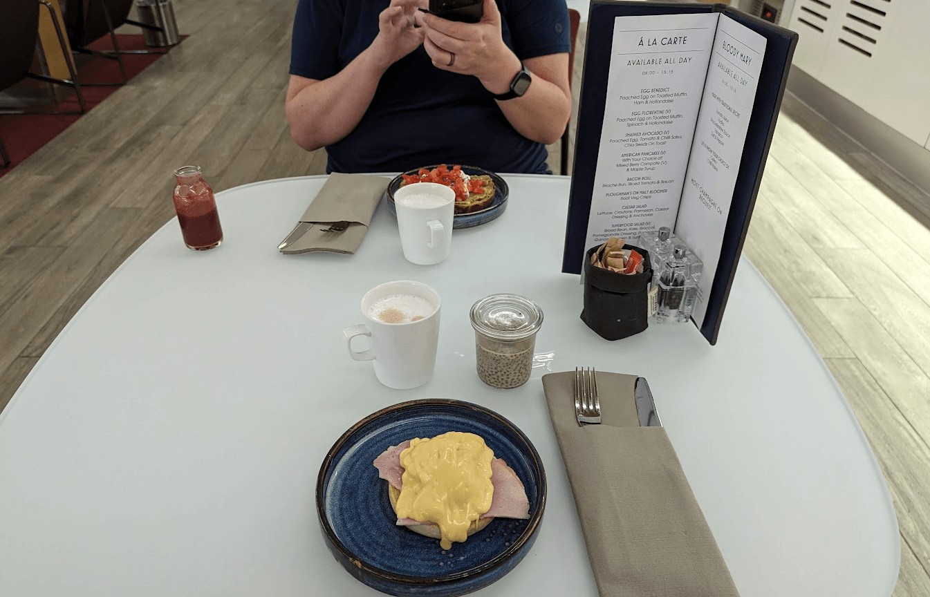 Travelers with enough time to sit down for a meal can order from the à la carte menu, which includes the following options like eggs benedict, smashed avocado, bacon roll, salad or "Ploughman's on malt bloomer." The short alcoholic drink menu features two options: bloody marys or Champagne.