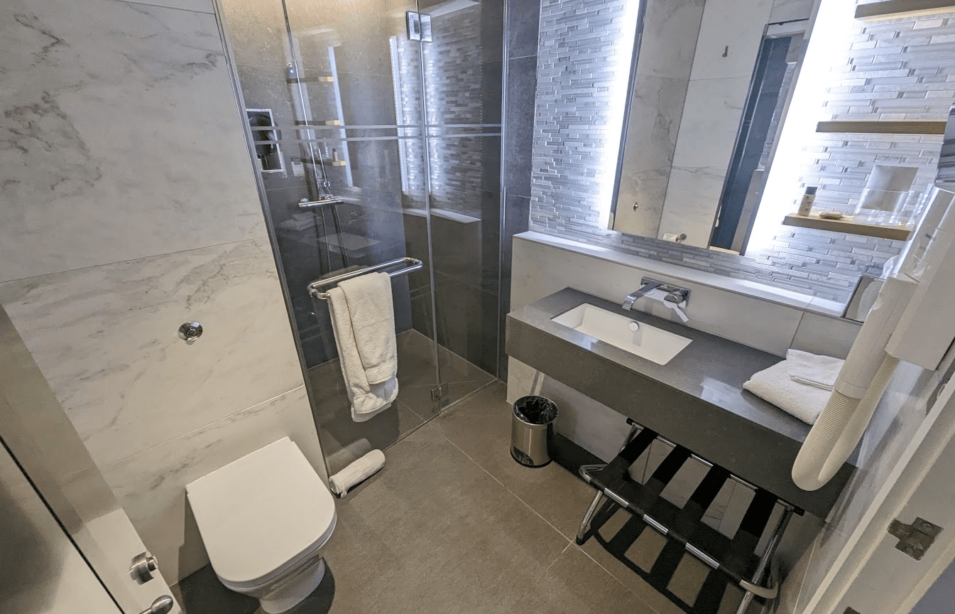 The shower offers two spraying options: an overhead rainfall-style showerhead and a hand-held shower wand. During my recent visit, individual bottles of shampoo and conditioner were conveniently located in the shower.