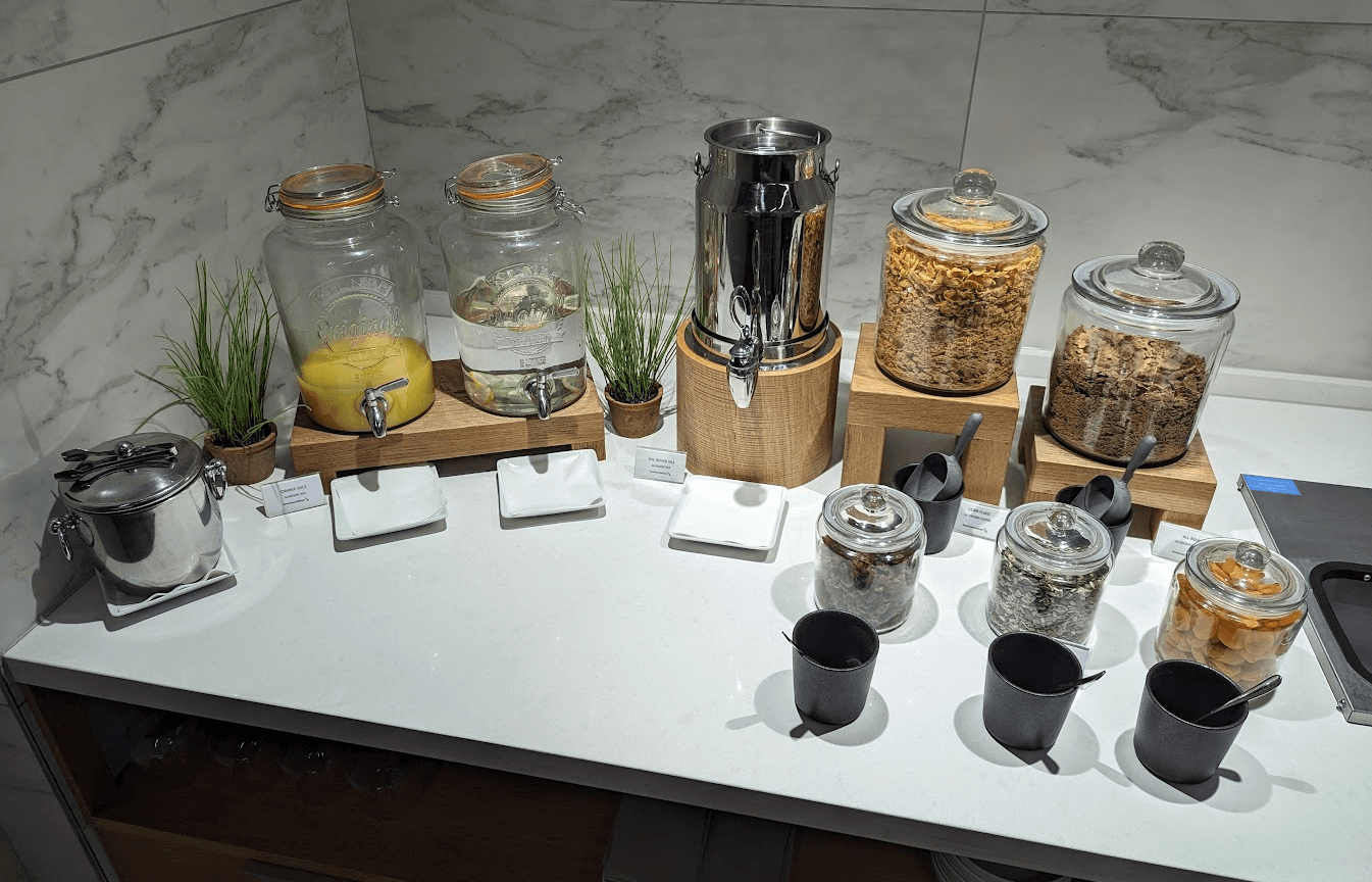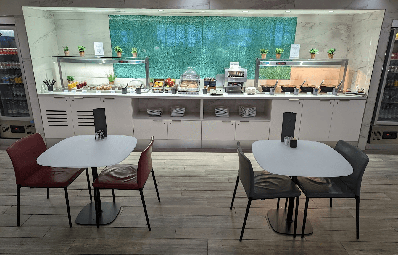 If you're in a hurry, you can get items from the self-serve buffet — which stretches across the entire length of the lounge's main room. The buffet offers traditional English warm breakfast items, breads, mini-sandwiches, fresh and dried fruits, cereals, yogurts, muesli, juices, canned sodas, teas and espresso-based coffee drinks.