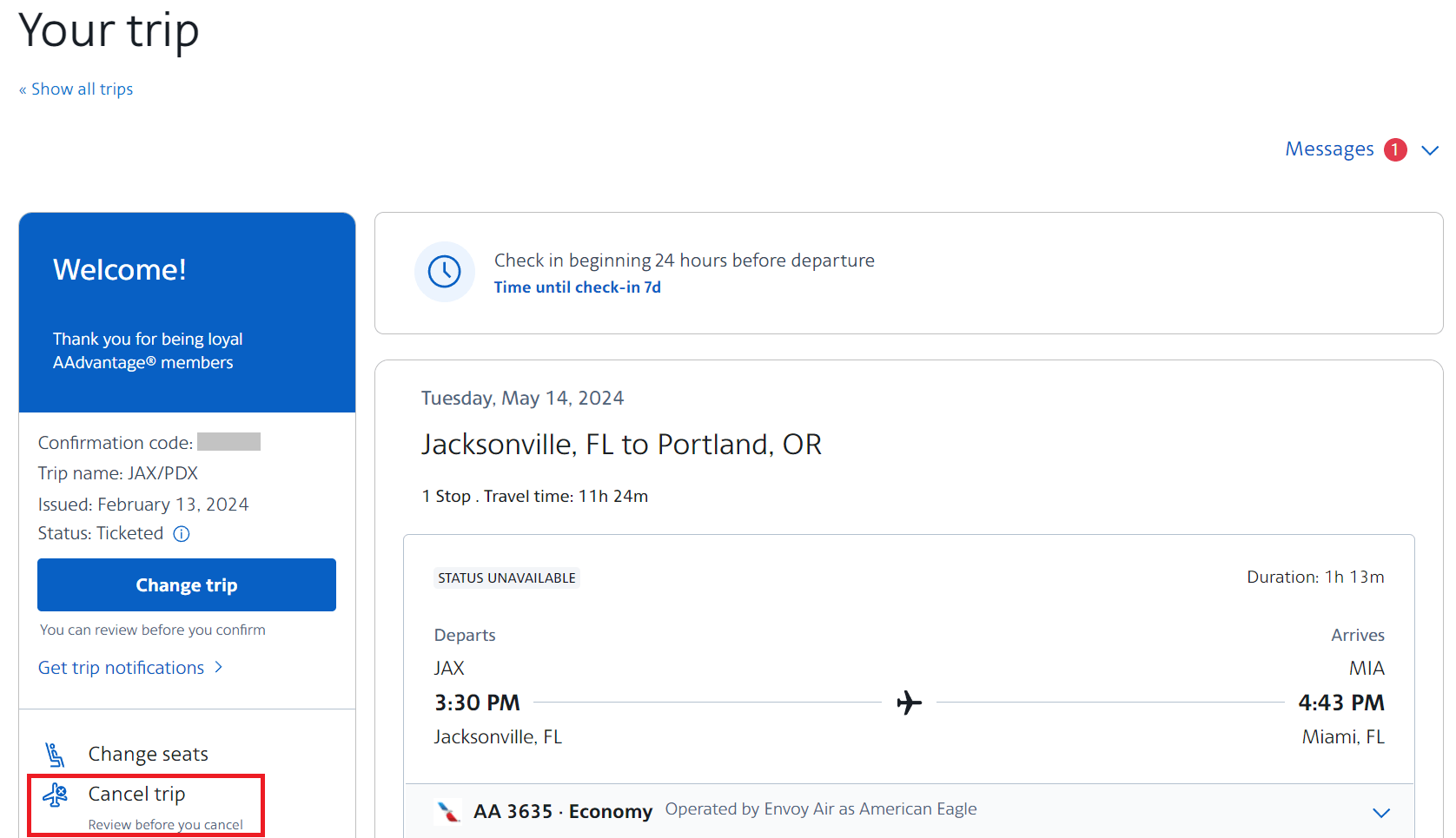 Many AAdvantage award tickets can also be refunded on American's website, but the process differs. Start by logging into your AAdvantage account, opening “All Trips,” clicking the reservation you wish to cancel and selecting "Cancel trip" on the sidebar.
