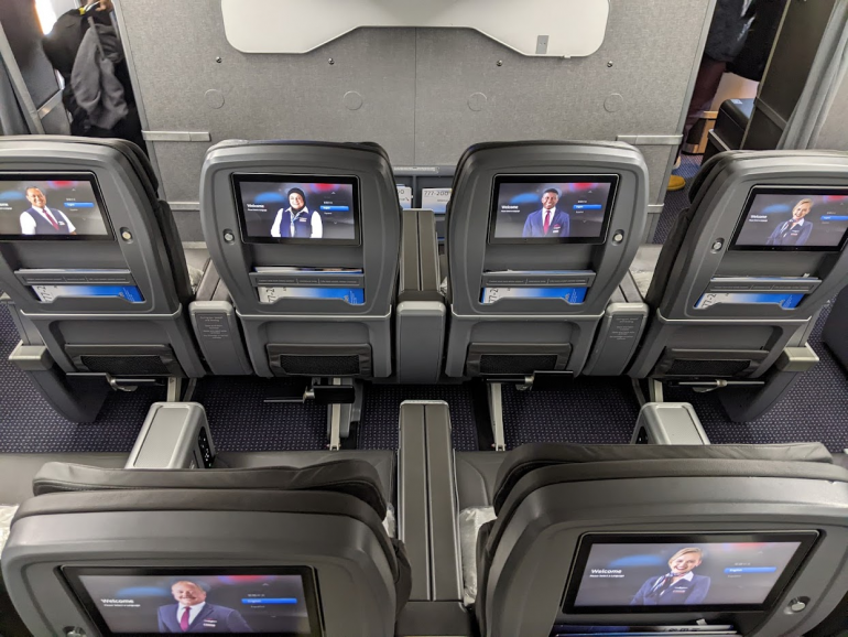 In American's 777-200ER premium economy, American Airlines installed eight seats per row — two on each side along the window and four in the middle.