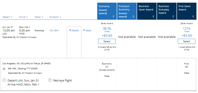 Connecting first class awards: If you need to book a connecting flight, LifeMiles may be a better option for first class flights. You’ll pay 66,000 LifeMiles each way for first class flights from Hawaii to Japan or 90,000 LifeMiles each way from the U.S. mainland to Japan.