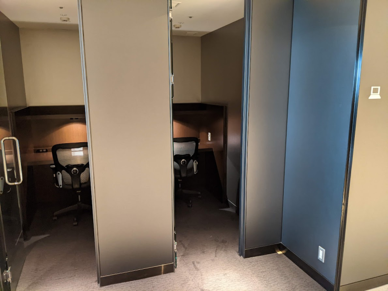 For a place to work, you'll find a few private booths with a desk, power outlets and a closing door.