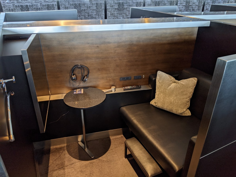 Each cubicle offers a lounge chair, power outlets, hangers for a coat, headphones, a personal TV and a small table.
