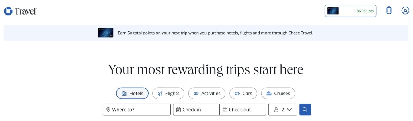 This will take you to Chase's travel portal, where you can book flights, hotels, cruises, cars and tour activities. To use the hotel credit, you'll select hotels, then input your travel details.