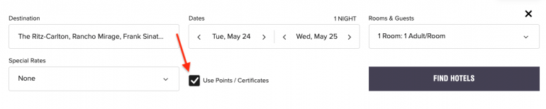 To find Cash + Points availability, go to the Marriott website and search for the destination or hotel. Input travel dates and select the “Use Points/Certificates” option.