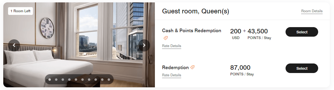 For example, one night at the Union Station Nashville Yards, Autograph Collection in Nashville, Tennessee, in May 2024 can cost 87,000 points or $645 plus taxes. Booking a Cash & Points rate gets you the same room for 43,500 points and $200.