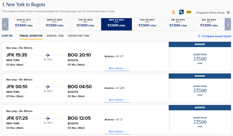 But you'll have to use 57,500 Singapore KrisFlyer miles to book the same route in Avianca business class:
