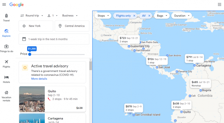 After selecting a route, Google Flights shows the options. Then, click through to Avianca's website or an online travel agency to book the flight.
