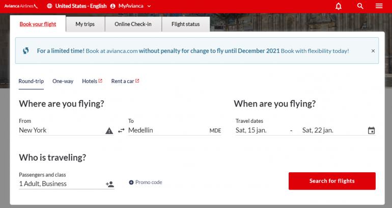 To book Avianca business class, search and book on Avianca's U.S. website. Enter routes, dates and select business class under the "Who is traveling" section.