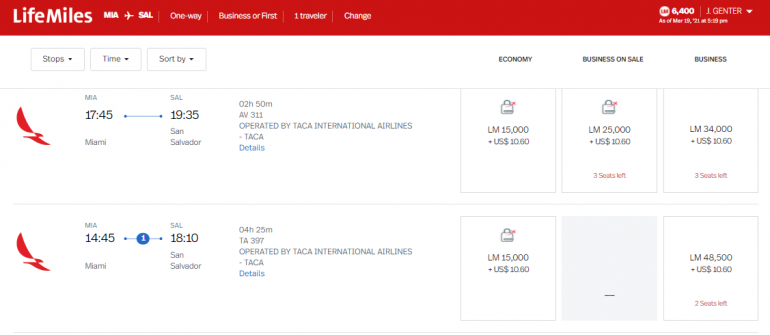 You can use LifeMiles — Avianca's mileage program — to book Avianca awards. Award rates vary based on the date and route. For example, an Avianca business class flight from Miami to San Salvador can cost 25,000 LifeMiles each way.